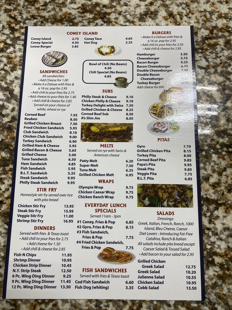Olympia Coney Island offers amenities such as Takeout, Delivery, Drive-Thru, Good for Kids, Brunch, Accepts Credit Cards, Accepts Contactless Payments, ensuring a comfortable and convenient experience for clients.